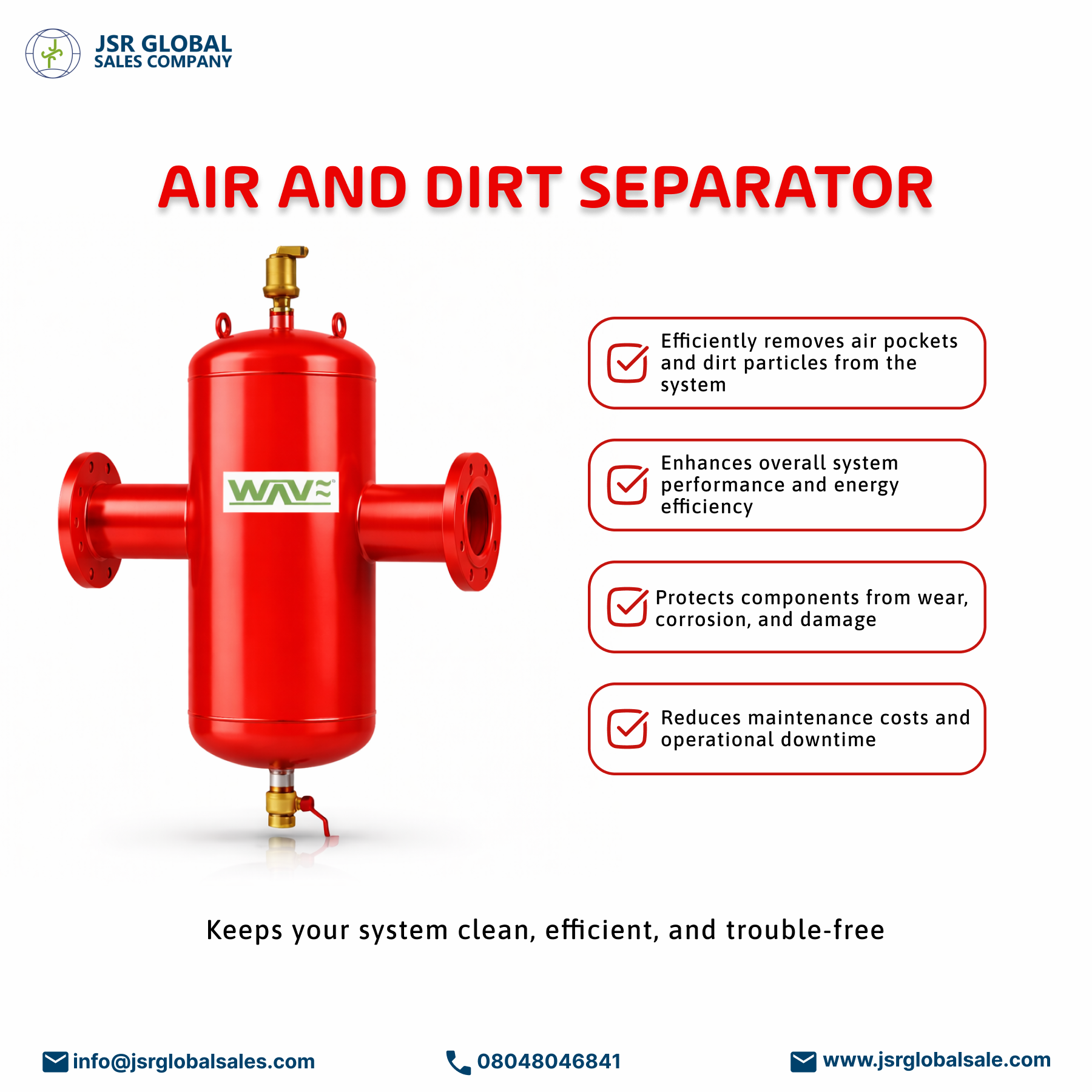 WAVE Air & Dirt Separator is designed to remove entrapped air and dirt particles from hydronic and water-based systems. It ensures clean fluid circulation, improves system efficiency, and protects equipment from damage in residential, commercial, and industrial applications.